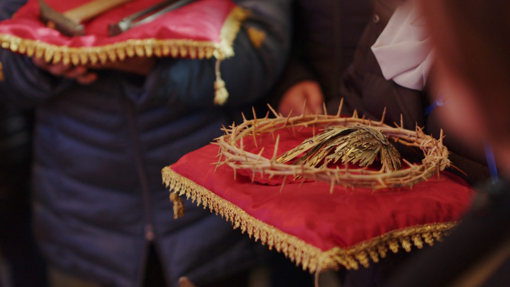 The laments are intoned near the small Chapel of Calvary, a site regarded by the local community as a true sanctuary and place of devotion. The singers and the chorus gather beneath the olive trees flanking the chapel on both sides. In this moment of solemn concentration—an act of mourning and reflection—two groups of cantors face each other in what becomes a ritualised, quasi-competitive performance. Each group is led by a principal singer who narrates, through chant, the principal episodes of the Passion and Holy Week.